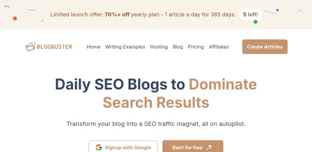 BlogBuster is an AI platform that helps users create high-quality, SEO-optimized blog articles automatically. It’s designed for solo founders, small startup teams, and marketing professionals who want to grow their organic traffic without hiring writers or spending hours writing content. It generates human-like articles with custom visuals and SEO tags, offers one-click publishing, hosting on BlogBuster, or integration with platforms like WordPress and Shopify, and provides trending topic ideas and adapts content to your brand’s style.
