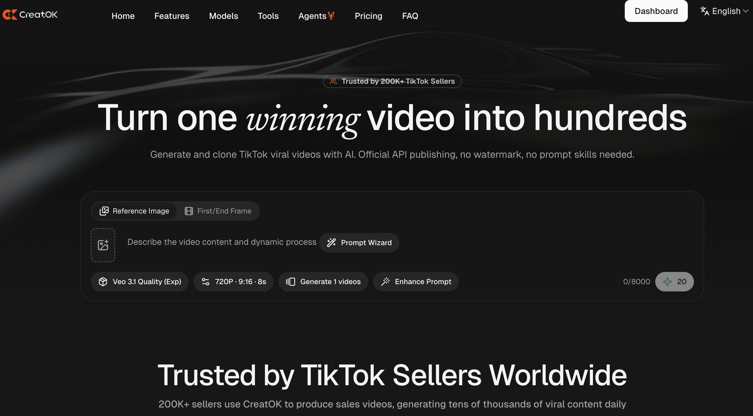 CreatOK is an AI TikTok e-commerce video generator based on Soar, Wan, Seedance, VEO, Nano Banana Pro, Kling and so on. Turn one winning video into hundreds. Generate and clone TikTok viral videos with AI. Official API publishing, no watermark, no prompt skills needed. You can create TikTok viral videos in 2 ways: AI-generated original videos, One-Click viral cloning. The tool allows users to create original sales content and mimic viral content with ease. It excels at transforming product photos and descriptions into engaging videos optimized for TikTok. Also, it offers the option to generate videos from scratch by inputting product information for AI to create high-quality sales videos or replicate popular trends by uploading a viral video. Key Features: - Viral Discovery: Identify trending and high-volume viral content currently blowing up on TikTok. - Text-to-Video: Generate e-commerce short videos instantly by simply uploading product images and inputting your specific requirements. - Video-to-Video (Viral Replication): A complete workflow that allows you to: Discover a viral hit → Deconstruct and analyze it → Fuse key elements for secondary creation → Produce a brand-new viral asset. - Consistent Characters: Solves the challenge of character consistency to a high degree, making it ideal for talking-head videos and single-scene content. Start Creating TikTok Viral Sales Videos. Join 200,000 TikTok sellers, use AI to generate high-quality sales videos, improve conversion rates, and reduce production costs. For more information, visit [www.creatok.ai].