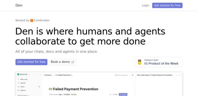 Den, the AI-powered workspace, is a platform that integrates communication, documentation, and AI agents into a unified workspace. It emerged from Y Combinator’s Winter 2025 batch, founded by Justin Lee and Linus Talacko, to transform how knowledge workers and remote teams manage information overload and automate routine tasks. Den is positioned as an AI-native communication and documentation platform designed to replace fragmented tools like Slack and Notion, offering a seamless collaboration environment between humans and AI.