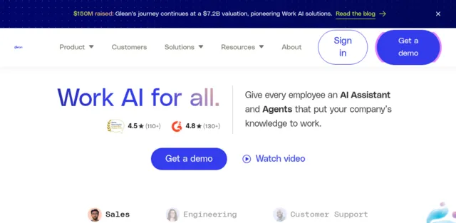 Glean serves engineering, sales, support, HR, retail, finance, and knowledge management teams in enterprises like Booking.com, BILL, and Deutsche Telekom.